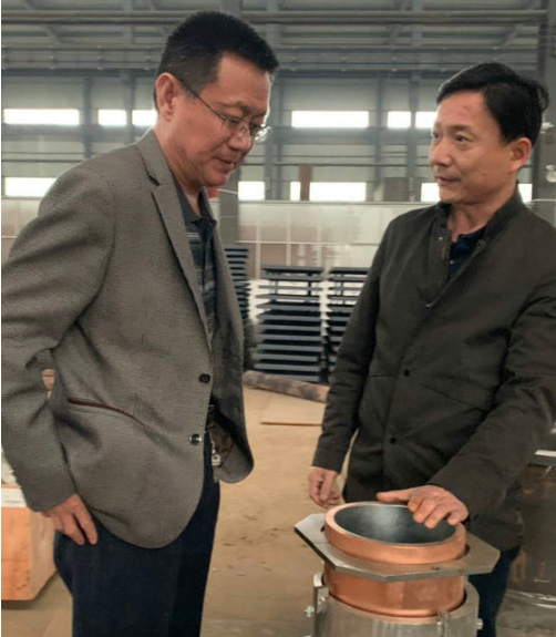 潍坊特钢厂长李炳亮(中)、工程师徐培升(右)与中钢联机械制造有限公司厂长普朝锋(左)合影留念。
