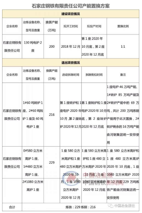 2018年10月30日,河北省工信厅发布了《河钢集团石家庄钢铁有限责任公司建设项目产能置换方案公示》,提出河钢石钢将于2018年12月在石家庄市井陉矿区开工建设新项目。在搬迁设计上,河钢石钢将在井陉矿区新建两座130吨电炉,换算产能为200万吨。